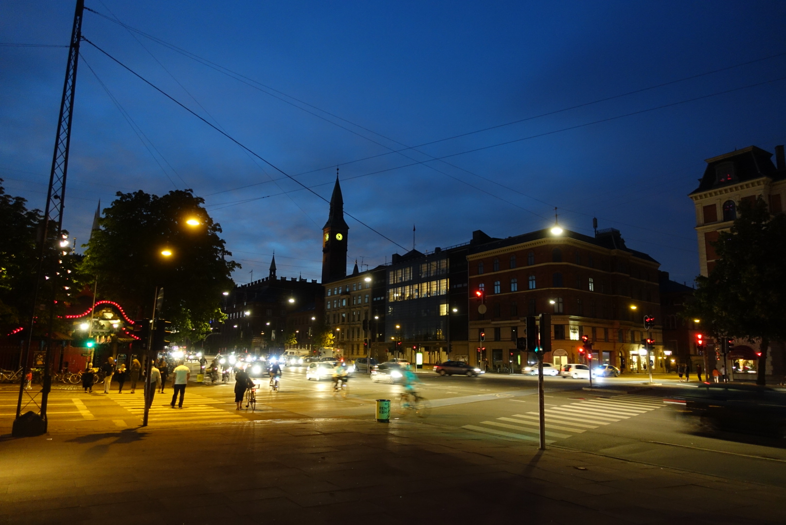 Crossing H. C. Andersens Blvd. (from lower left) and Tietgensgade (from lower right). The clock tower is from the town hall. The entrance with the red lights belongs to Tivoli Gardens, a 19th-century amusement park.