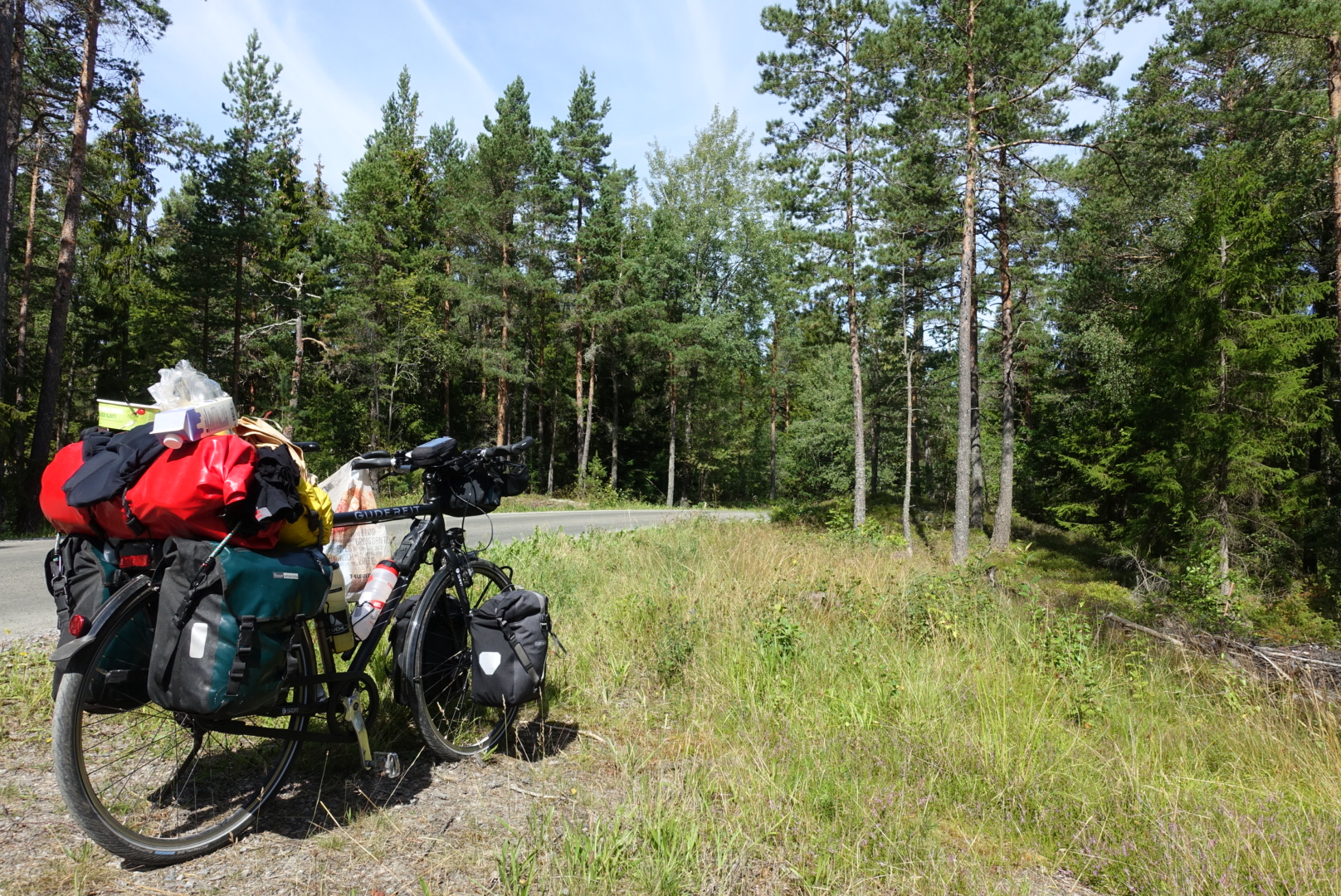 During a motivational snack pause, I met a Swedish bike traveller, who, as it turned out, did not just travel but lived that way. Meaning no job, no home, just slowly riding through Sweden, camping in the woods or staying in a town for a few days before heading on. He was in his fifties and stated that Sweden is a boring country and that’s his way of having fun. We chatted a bit, and he tried to give me advise for my trip. Most notably the warning of wolves and, starting 200 km further north, bears. However, he proposed sleeping in the woods instead of camp sites, and sneaking into one of the them from time to time to have a shower.