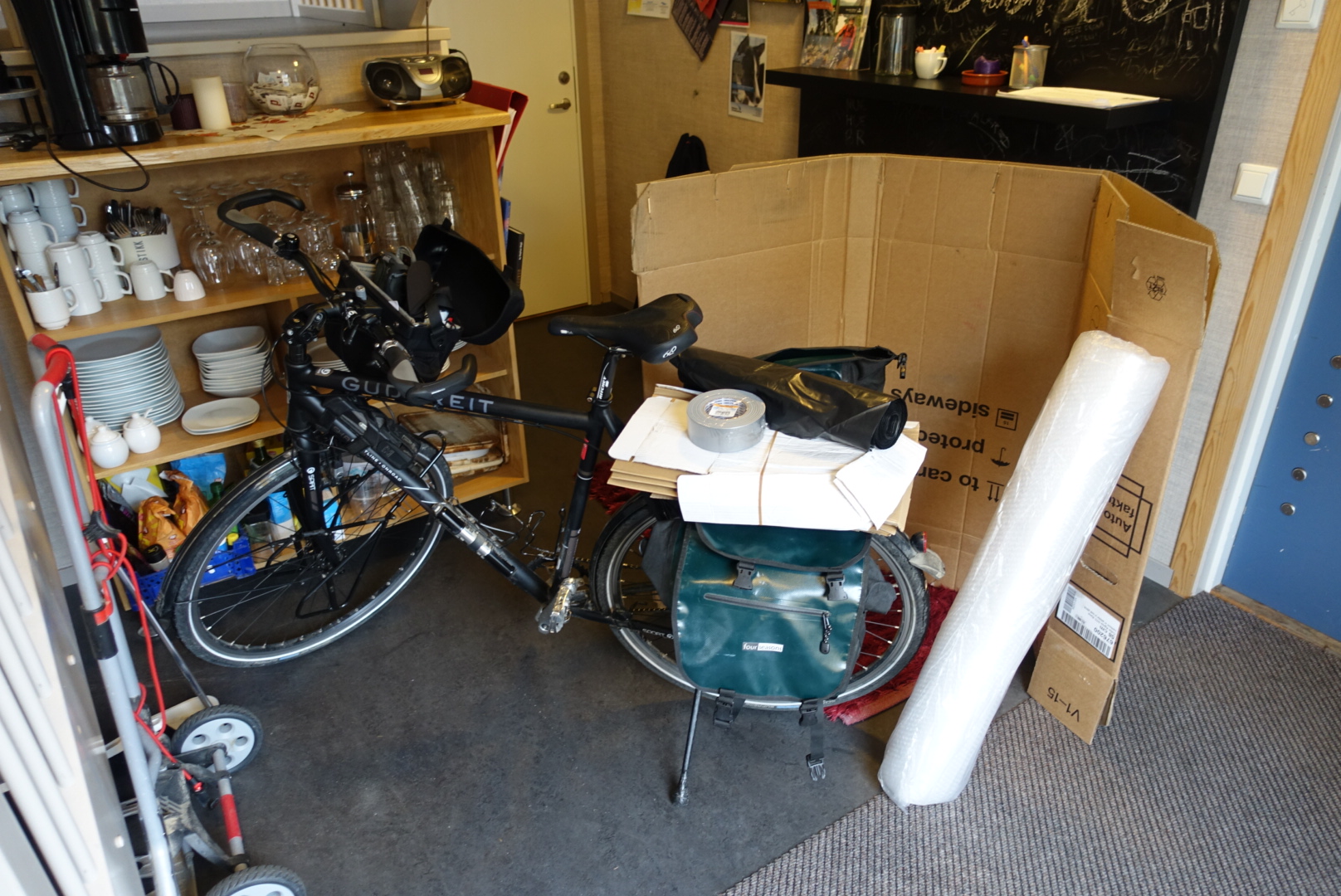 The next quest on my way home was getting packaging material for the bike. I drove to a bike store and got a cardboard box for free. In a DIY shop, I got 10 m² of bubble wrap, 50 m of duct tape, and some large, stable 120 litre waste bags. Now that’s an interesting packing problem.