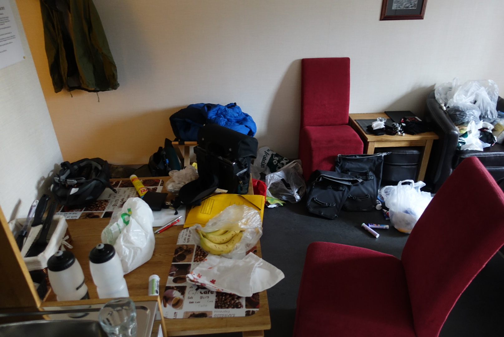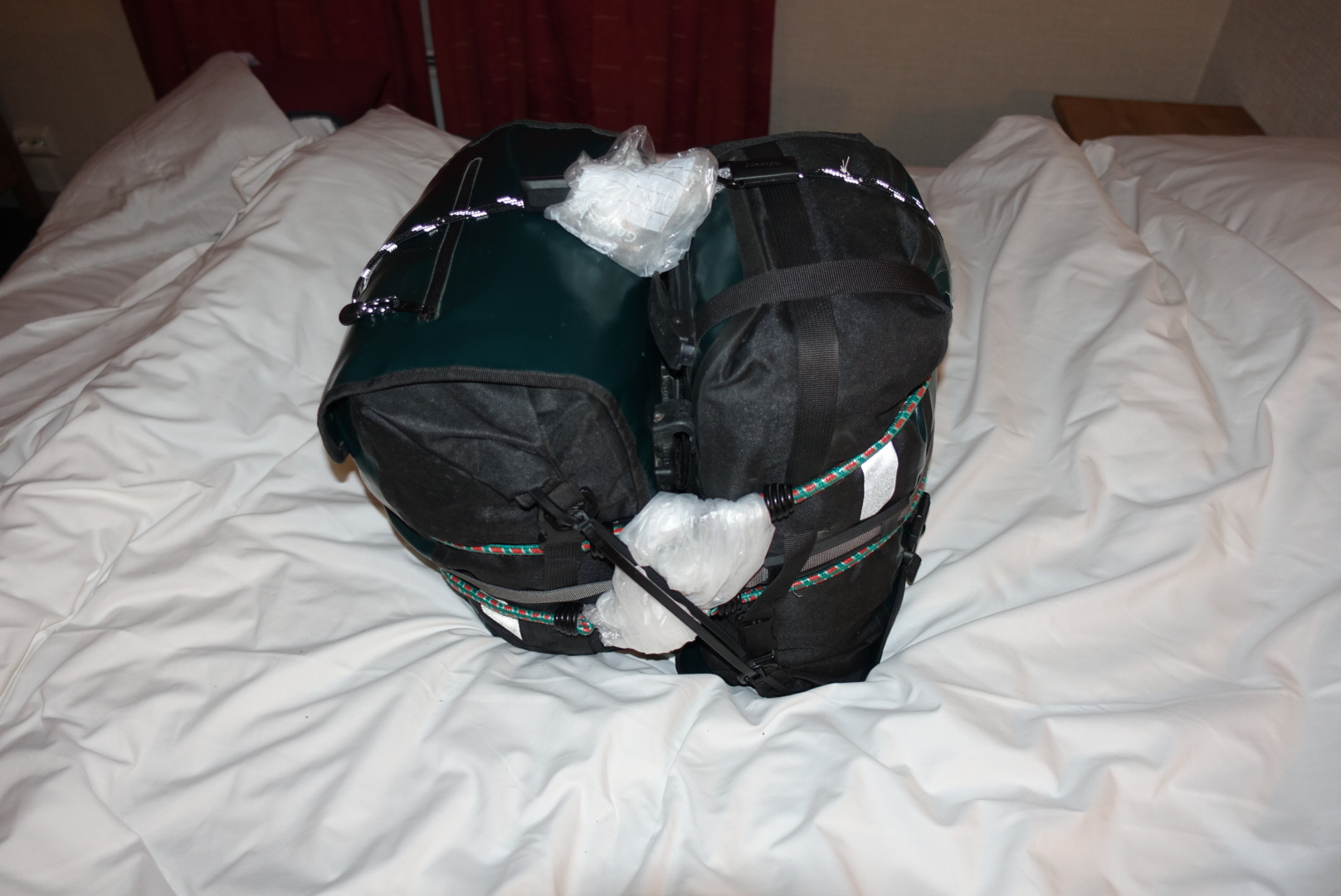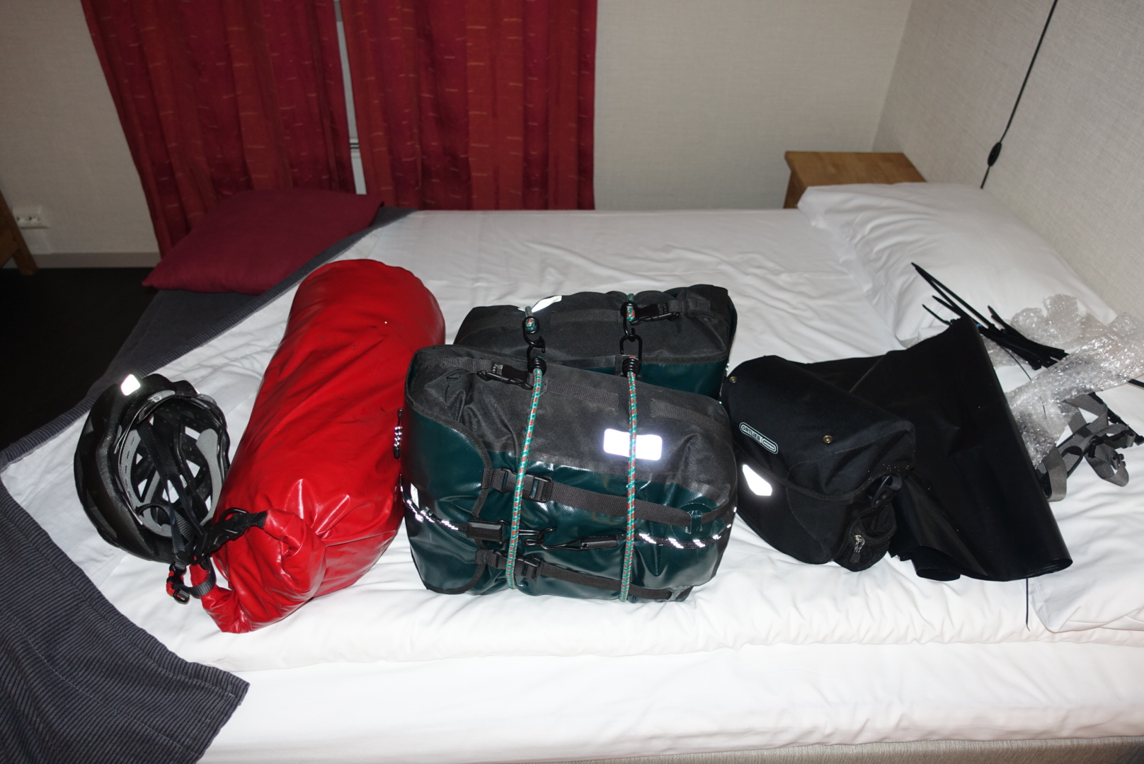Back in the room, I transformed the chaos from above into this neat package. The tent minus the pegs (not suitable for cabin luggage), the sleeping bag, and the Crocs are in the red bag. Together with the handlebar bag, and the helmet, that’s less than 8 kg of hand luggage roughly meeting the size constraints.