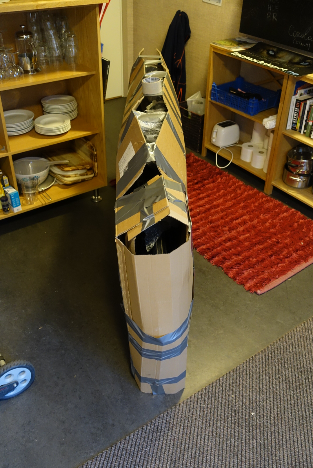 With some additional cardboard and a lot of tape, i.e. all of it, I managed to create this beauty of a package. I included the sleeping mat and bike bottles as further protection, and to not have them in the other luggage.