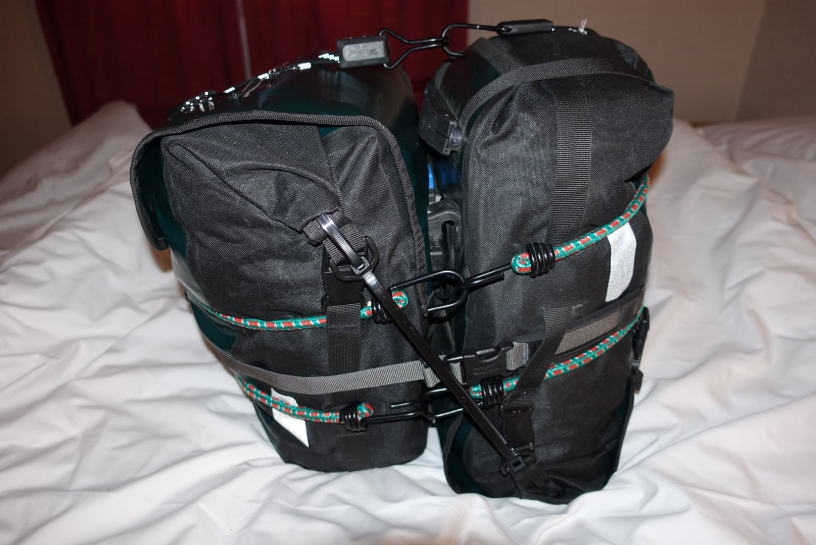 I emptied the front bags and put them into the rear bags. I then packed everything else without any gaps in-between to the rear bags as well. I used some zip ties, and the bungee cords to create a single bag out of both rear bags, …