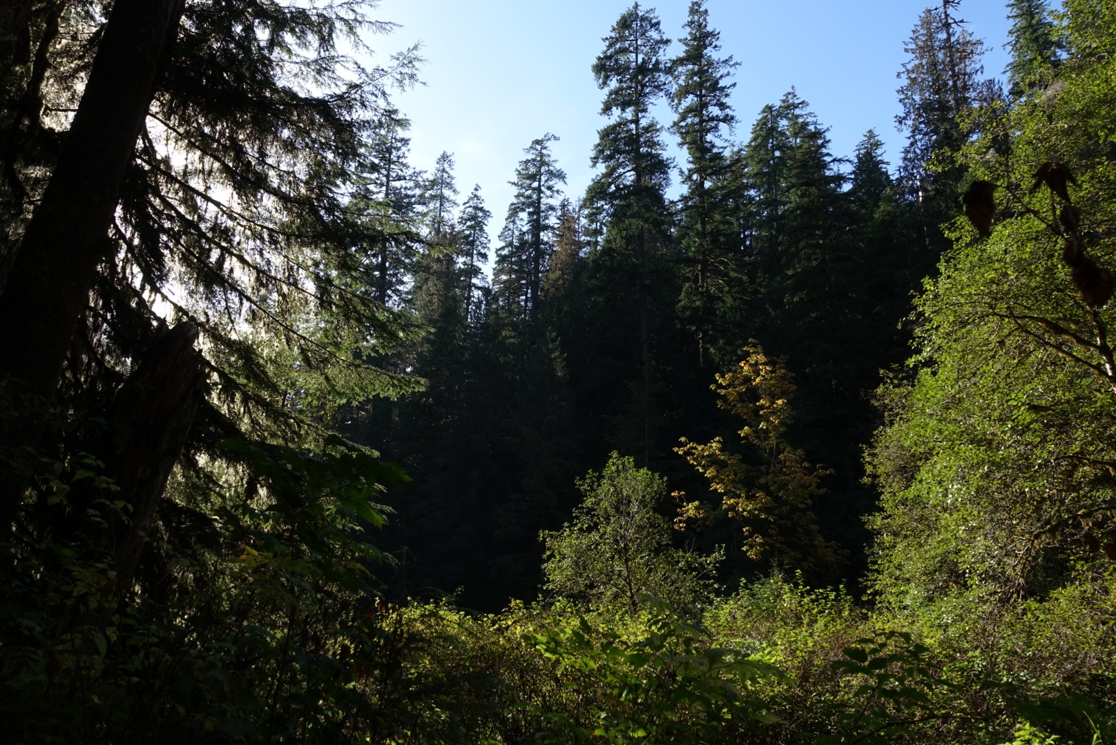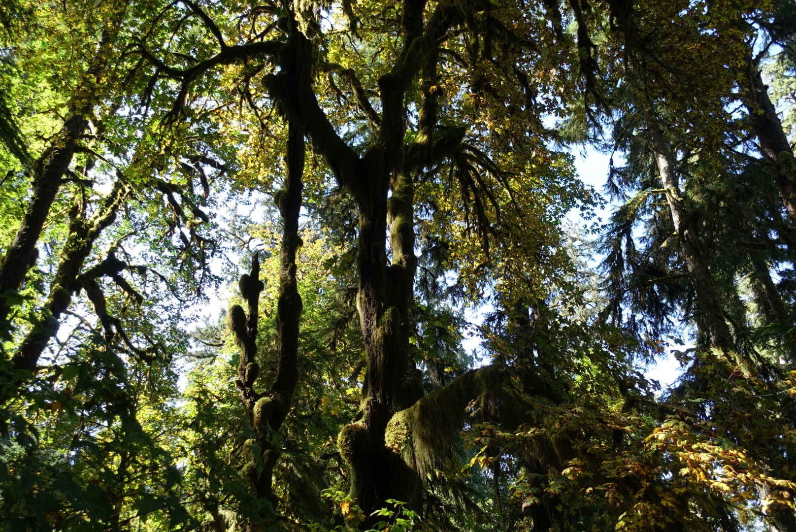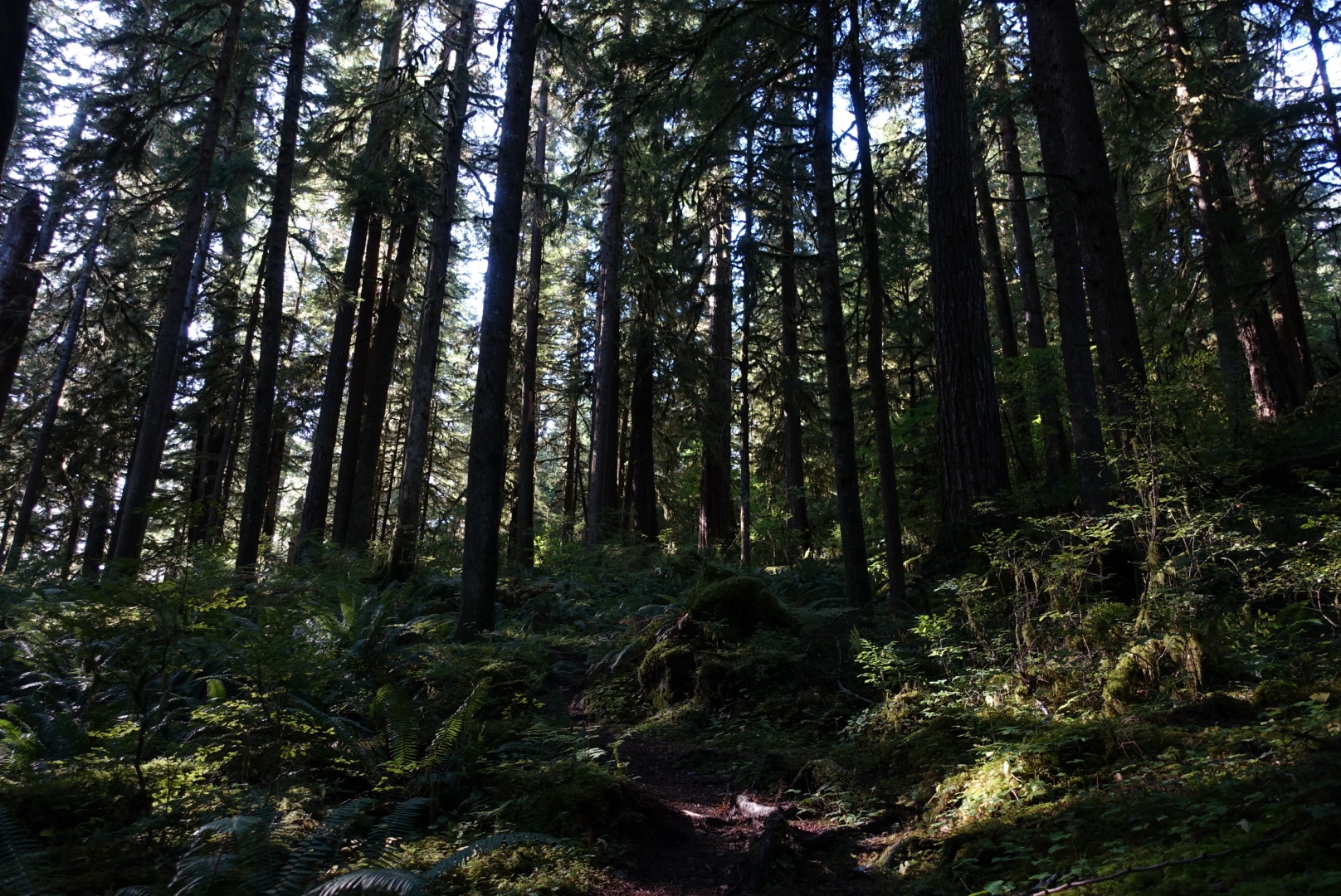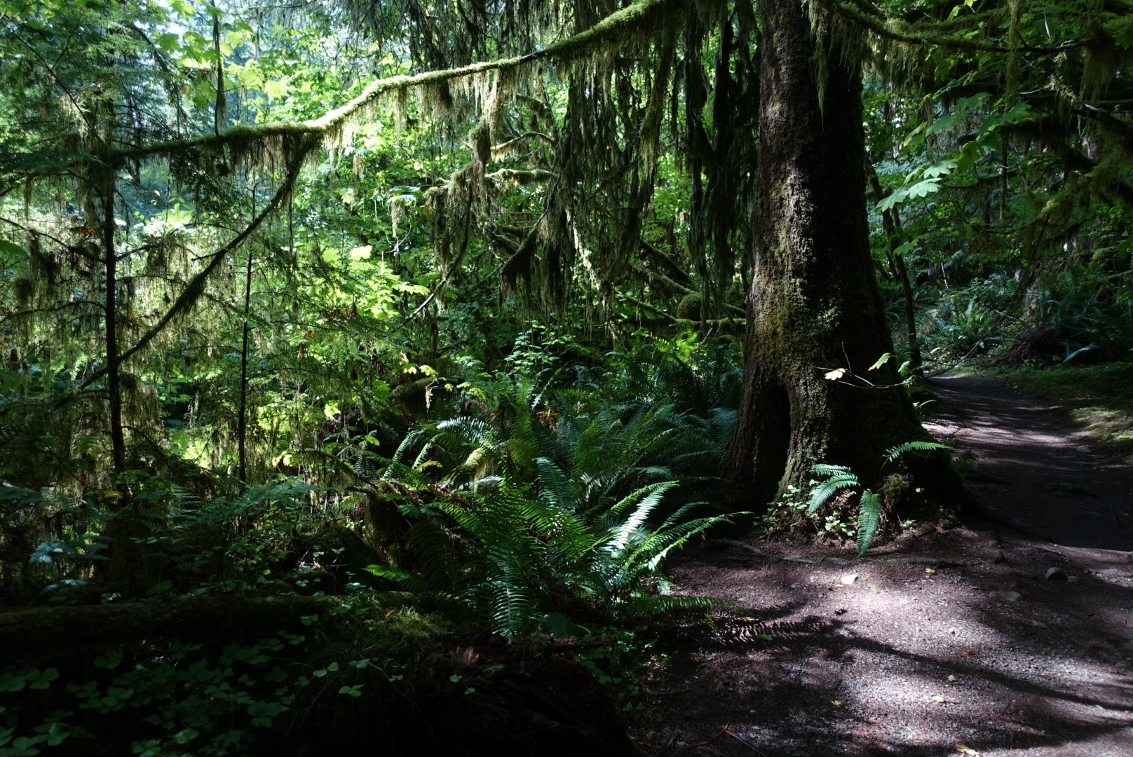 We continued our drive along the South Shore Road and beyond towards the Irely Lake trail head. The forest along the road had less giant trees and more broadleaves, but still had all the ferns, moss, and lichens hanging from them. The prior trail was in a state park, now we entered Olympic National Park again.