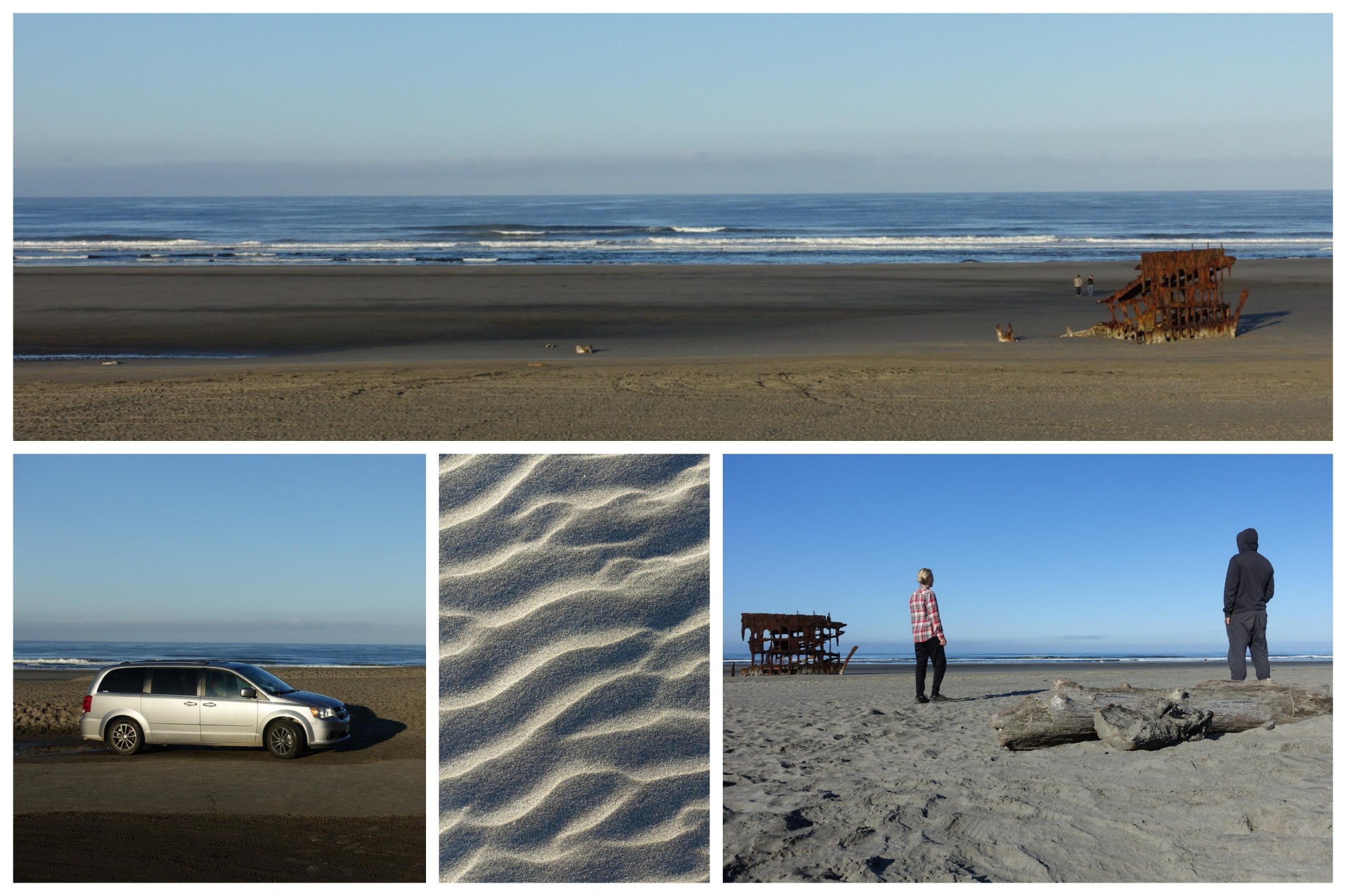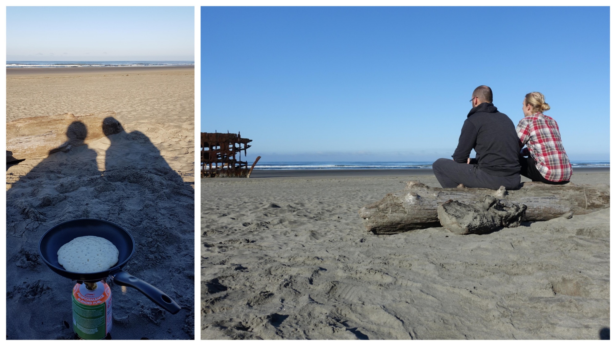 Some pieces of drift logs served us as seats and our kitchen box became a table. The scenery was enriched with the wreck of the Peter Iredale emerging from the sand. We watched the waves, while making pancakes.