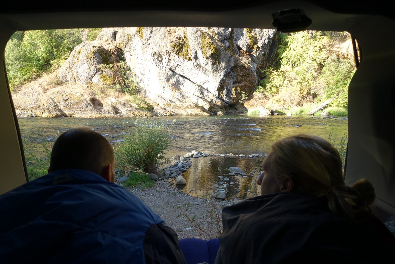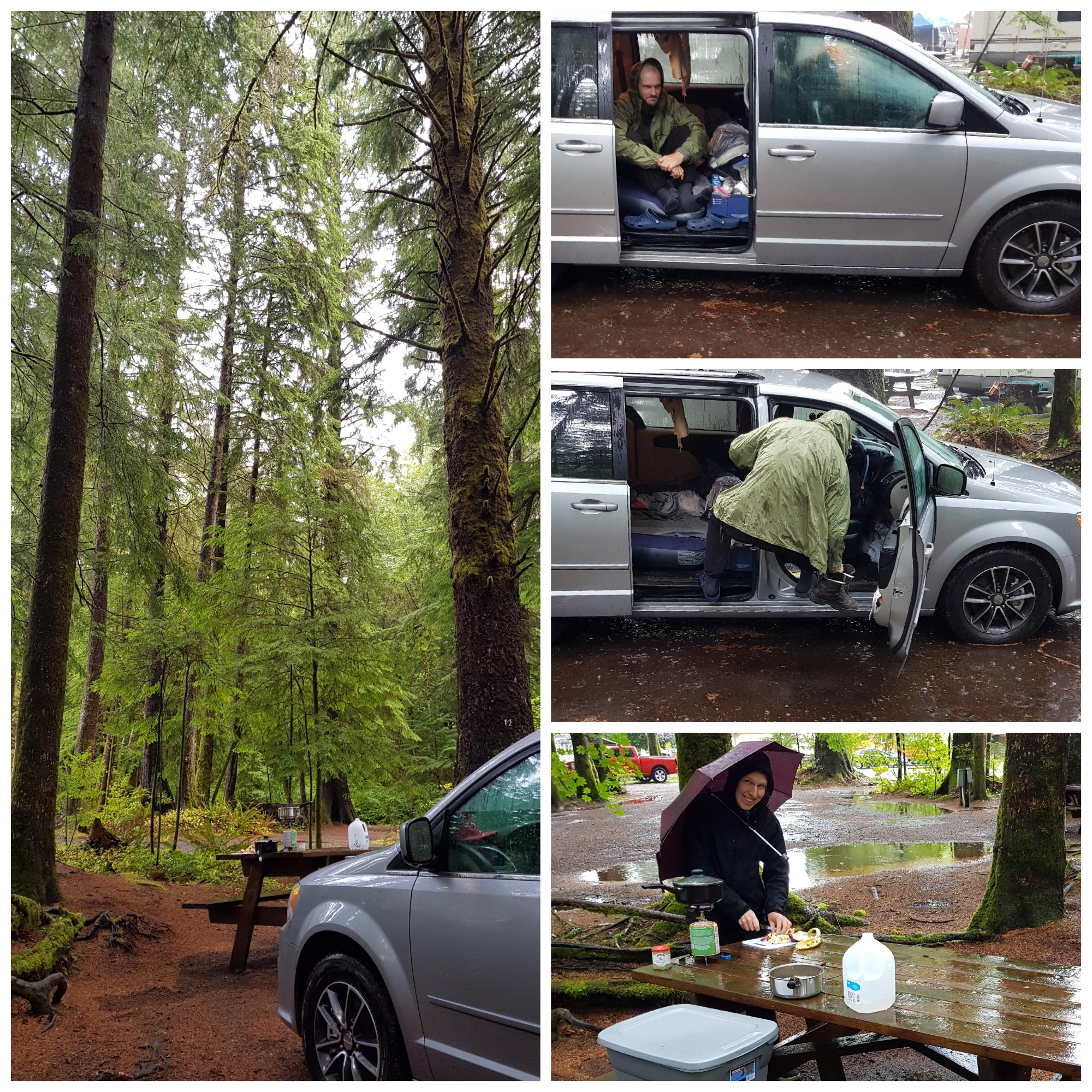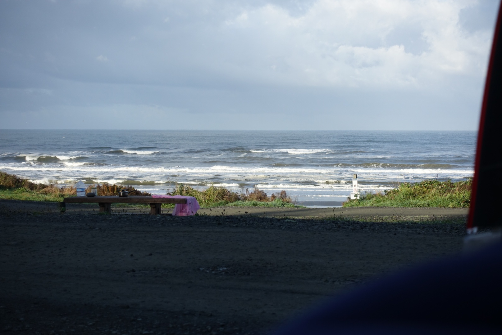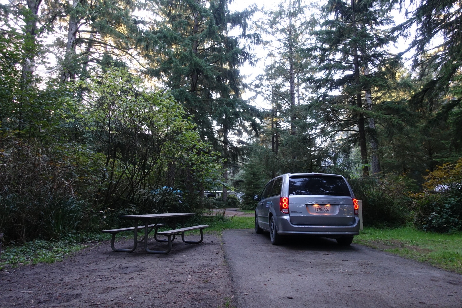 We had to get up early today, as we had a to be at Portland International Airport at 15:00 latest to return our beloved car. The alarm was set to 07:30, and with the help of a motivational song, i.e. “Eye of the Tiger”, we quickly left our sleeping bags and started the day. Just in that moment, two park rangers drove by checking the sites. After having checked in ourselves late yesterday, we could pay the site fee directly saving us the way to the office later. They also gave us a map of the park, as we were going to have breakfast somewhere more scenic than our RV site.